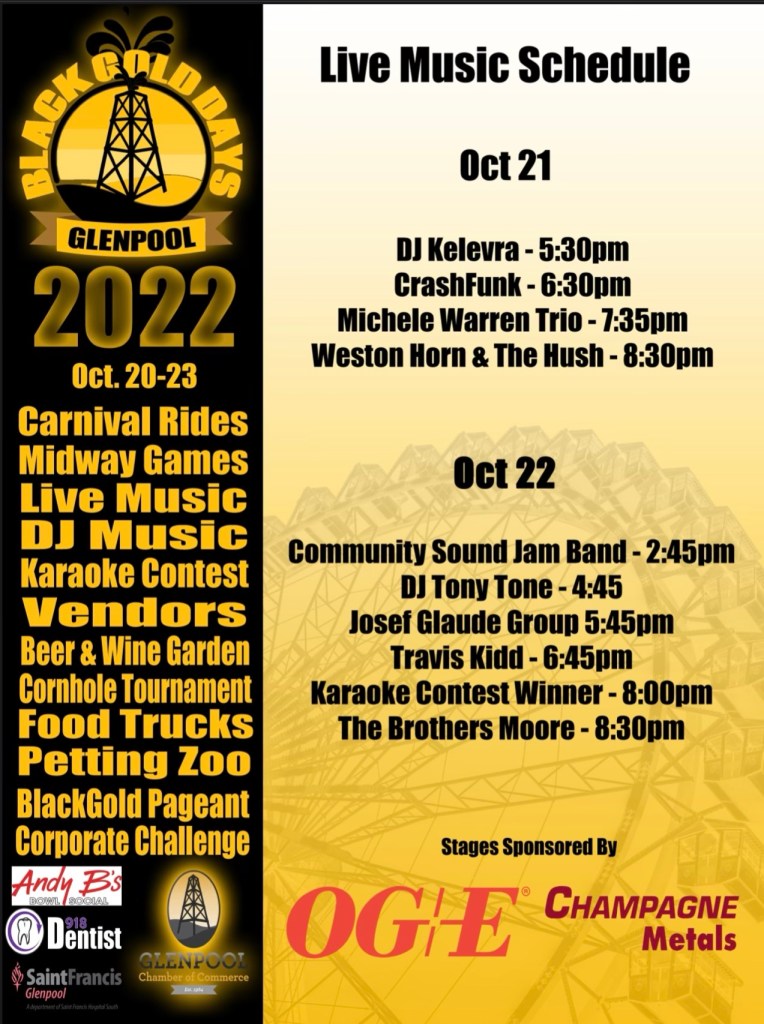 Friday, Oct 21 at Black Gold Days Festival by mwarren on October 17, 2022October 17, 2022 Share this: Click to share on X (Opens in new window) X Click to share on Facebook (Opens in new window) Facebook
